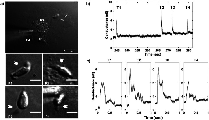 Obligate intracellular parasites invade host cells to survive. Following host cell contact, the apicomplexan Toxoplasma gondii injects proteins required for invasion into the host cell. Here, electrophysiological recordings of host cells acquired at sub-200 ms resolution allowed detection and analysis of a transient increase in host membrane conductance following exposure to Toxoplasma gondii. Transients always preceded invasion but parasites depleted of the moving junction protein RON2 generated transients without invading, ruling out a direct structural role for RON2 in generating the conductance pathway or restricting the diffusion of its components. Time-series analysis developed for transients and applied to the entire transient dataset (910,000 data points) revealed multiple quantal conductance changes in the parasite-induced transient, consistent with a rapid insertion, then slower removal, blocking, or inactivation of pore-like conductance steps. Quantal steps for RH had a principal mode with Gaussian mean of 0.26 nS, similar in step size to the apicomplexan protein translocon EXP2. Without RON2 the quantal mean was significantly different (0.19 nS). Because no invasion occurs without poration, the term 'invasion pore' is proposed.