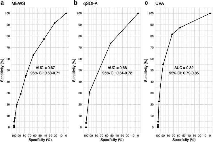 Findings: A total of 2797 participants were included in this analysis. The median (IQR) age was 32 (24-43) years, 38% were inpatients, and 60% (1684/2797) were female. By the time of follow-up, 7% (185/2797) had died. The AUC (95% CI) for MEWS, qSOFA and UVA were 0.67 (0.63-0.71), 0.68 (0.64-0.72), and 0.82 (0.79-0.85), respectively. The AUC comparison found UVA outperformed both MEWS (p < 0.001) and qSOFA (p < 0.001).