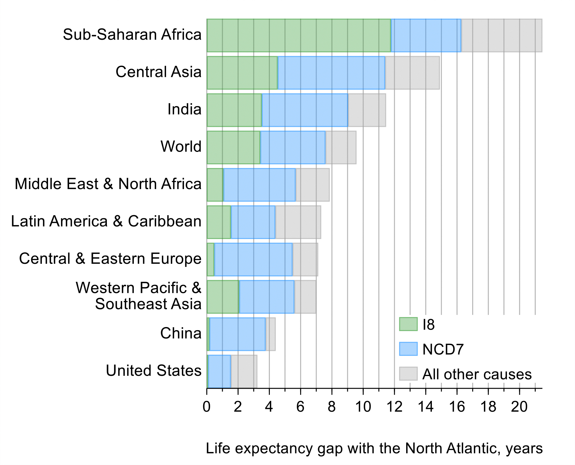 The path to achieving “50 by 50” runs through control of a remarkably narrow set of just 15 conditions. For currently high mortality countries, eight infectious diseases and maternal conditions are the highest priority. Seven clusters of noncommunicable diseases and injuries are important everywhere and addressing them will prove central to achieving “50 by 50” in most countries with lower initial levels of mortality.