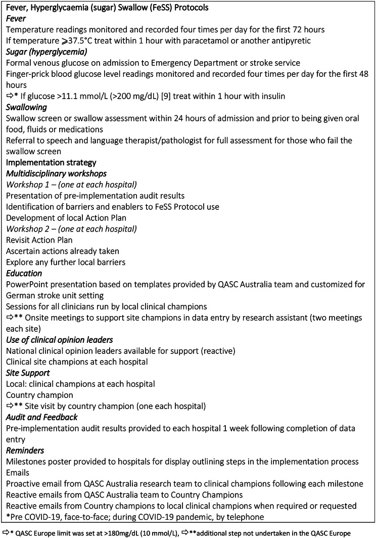 Conclusions: Supported implementation of the FeSS Protocols significantly improved acute care for post stroke complications of fever, hyperglycaemia and dysphagia in terms of higher adherence and shorter time to treatment.
