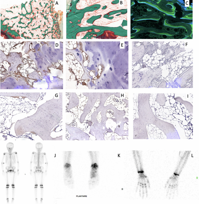 Atypical hemolytic uremic syndrome (aHUS) is a thrombotic microangiopathy, related to complement dysregulation, including Factor H deficiency (FH) treated by lifelong eculizumab therapy. Its long-term tolerance is not yet fully described. We report two patients with genetic FH deficiency receiving long-term eculizumab and displaying a peculiar bone phenotype. First case is a 13-year-old girl, presenting with bone pains, arthritis, and deformities, for which X-rays and MRI described multifocal osteochondritis. Bone biopsy revealed an active remodeling bone (many areas of bone formation and resorption) and C3c accumulation on immunohistochemical staining. The second patient is an 11-year-old girl, displaying mechanical bone pains, for which bone scintigraphy found hypofixation of wrists and ankles. These findings could be consistent with a side effect of eculizumab, as C3c accumulation may result from the downstream C5-blockade. Alternatively, bone alterations could be due to the absence of FH, as described in murine models. Further investigations are required to characterize bone disease in aHUS.