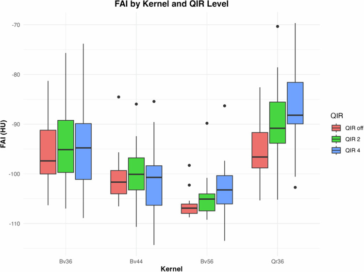 Results: Intra- and inter-reader agreement of FAI was excellent (intra-class correlation coefficient = 0.99 and 0.98, respectively). Significant differences in FAI were observed depending on the kernel and iterative reconstruction strength level (each, p < 0.001), with considerable inter-individual variation up to 34 HU and intra-individual variation up to 33 HU, depending on kernels and iterative reconstruction levels. The ESFs showed a reduced range of edge-smoothing with increasing kernel sharpness, causing an FAI decrease. Histogram analyses revealed a narrower peak of PCAT values with increasing iterative reconstruction levels, causing a FAI increase.