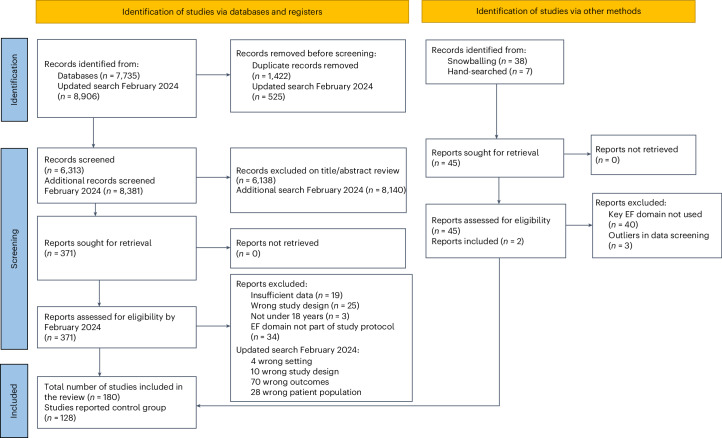 Executive function (EF) delays are well documented in paediatric neurodevelopmental conditions (NDCs). There is no consensus about whether EF delay represents a transdiagnostic feature of NDCs. This systematic review and meta-analysis synthesized 180 studies reporting two or more NDC comparisons on EF, examined differences between NDCs, and the moderating effects of gender, age, publication year, DSM editions and assessment types. Studies using established EF measures across seven domains (attention, fluency, set-shifting, set-switching, response inhibition, planning and working memory) in participants under 18 were included. Summary effects were compared: (1) for all reported NDCs relative to control, (2) for each individual NDC relative to control and (3) between NDC groups. Results confirmed that EF delay was a transdiagnostic feature of neurodevelopmental delay, with a moderate effect size of delay across all NDCs (g = 0.56, 95% confidence interval (CI) 0.49-0.63) compared with control. This effect increased with comorbidities (g = 0.72, 95% CI 0.59-0.86), DSM-5 criteria and informant measures. Comparisons between NDCs revealed few differences: children with tic disorders (TD) showed smaller EF delays, children with attention-deficit/hyperactivity disorder (ADHD) showed larger delays in attention, response inhibition, planning and working memory compared with TD and specific learning disorders, while children with autism spectrum disorders showed greater delays on set-switching compared with ADHD. Findings support transdiagnostic models of neurodevelopment to further a developmentally sensitive science that can reveal how EF delays contribute to brain circuitry, symptom profiles and functioning, and ultimately support early interventions and outcomes for all children with NDCs.