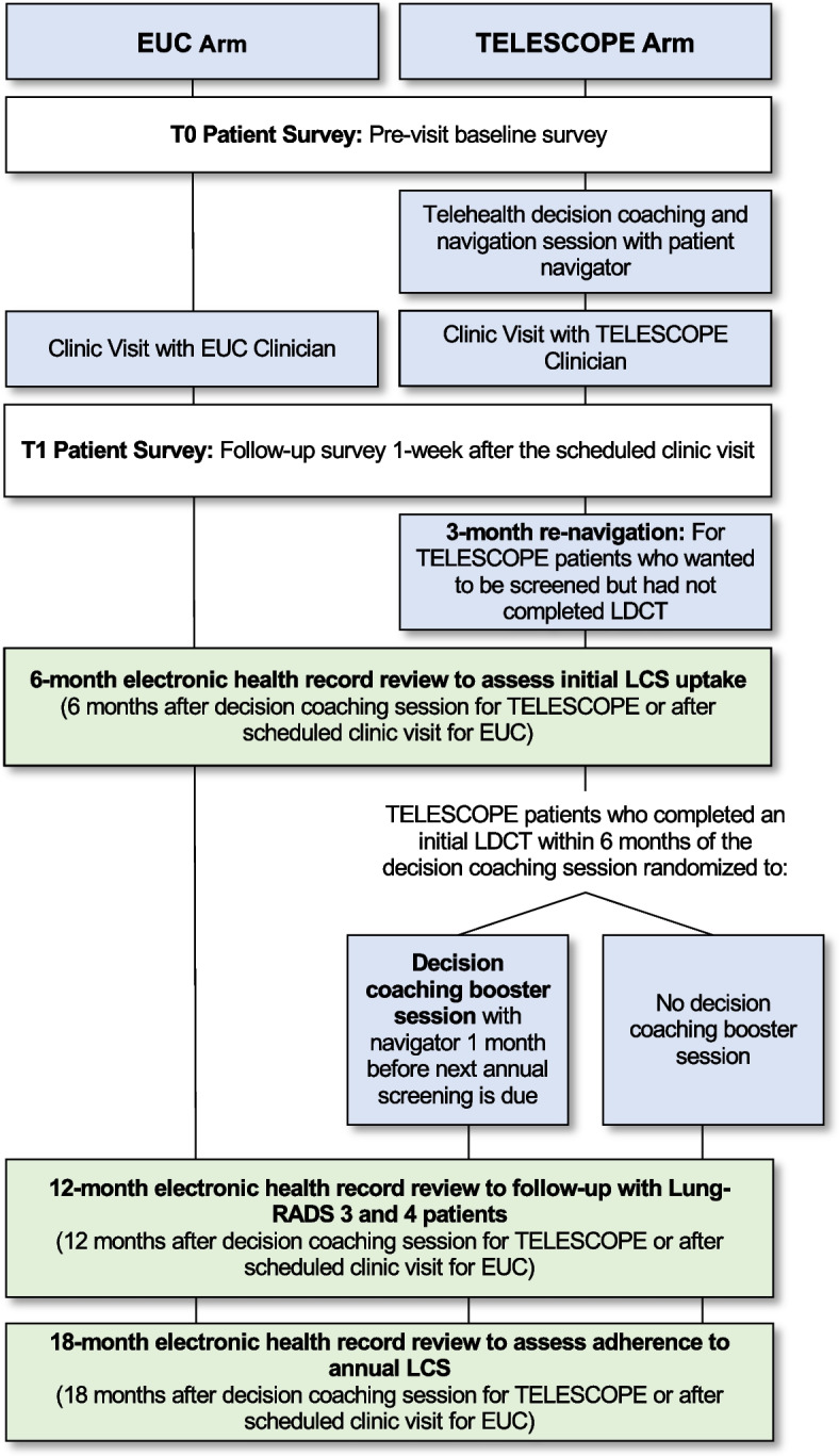 Methods: Patients (n = 420) of primary care clinicians (n = 120) are being recruited to a cluster randomized controlled trial. Clinicians are randomly assigned to 1) TELESCOPE intervention: prior to an upcoming non-acute clinic visit, patients participate in a telehealth decision coaching and navigation session about LCS delivered by trained patient navigators and nurse navigators place a low-dose CT scan (LDCT) order for each TELESCOPE patient wanting LCS, or 2) EUC: patients receive enhanced usual care from a clinician. Usual care is enhanced by providing clinicians in both arms with access to a Continuing Medical Education (CME) webinar about LCS and an LCS discussion guide. Patients complete surveys at baseline and 1-week after the scheduled clinic visit to assess quality of the SDM process. Re-navigation is attempted with TELESCOPE patients who have not completed the LDCT within 3 months. One month before being due for an annual screening, TELESCOPE patients whose initial LCS showed low-risk findings are randomly assigned to receive a telehealth decision coaching booster session with a navigator or no booster. Electronic health records are abstracted at 6, 12 and 18 months after the initial decision coaching session (TELESCOPE) or clinic visit (EUC) to assess initial and annual LCS uptake, imaging results, follow-up testing for abnormal findings, cancer diagnoses, treatment, and tobacco treatment referrals. This study will evaluate factors that facilitate or interfere with program implementation using mixed methods.