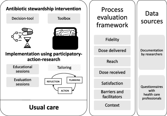 Methods: We conducted a process evaluation alongside the cluster RCT. The ASI consisted of a decision-tool and a toolbox, which were implemented using a participatory-action-research (PAR) approach with sessions for education and evaluation. We documented the implementation process of the intervention and administered a questionnaire to health care professionals (HCPs) from participating organizations in the intervention and usual care clusters. We evaluated the multiple components of the intervention and its implementation following a structured framework.