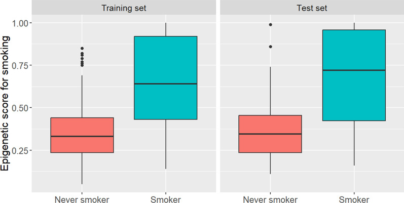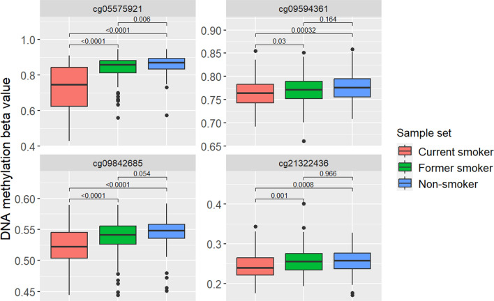 Results: We found > 450 significant CpGs associated with cigarette consumption, and overrepresented in various biological functions including cell communication, response to stress, blood vessel development, cell death, and atherosclerosis. The model consisting of cg05575921 in AHRR (p = 4.5 × 10-32) and three additional CpGs (cg09594361, cg21322436 in CNTNAP2 and cg09842685) was able to predict smoking status with a high accuracy of AUC = 0.8 in the test set. Importantly, a gradual increase in the probability of smoking was observed, starting from occasional smokers to regular heavy smokers. Furthermore, former smokers displayed the intermediate DNA methylation profiles compared to current and never smokers, and thus our results indicate the potential reversibility of DNA methylation after smoking cessation. The AHRR played a key role in a predictive analysis, explaining 21.5% of the variation in smoking. In addition, the AHRR methylation was analyzed for association with other modifiable lifestyle factors, and showed significance for sleep and physical activity. We also showed that the epigenetic score for smoking was significantly correlated with most of the epigenetic clocks tested, except for two first-generation clocks.