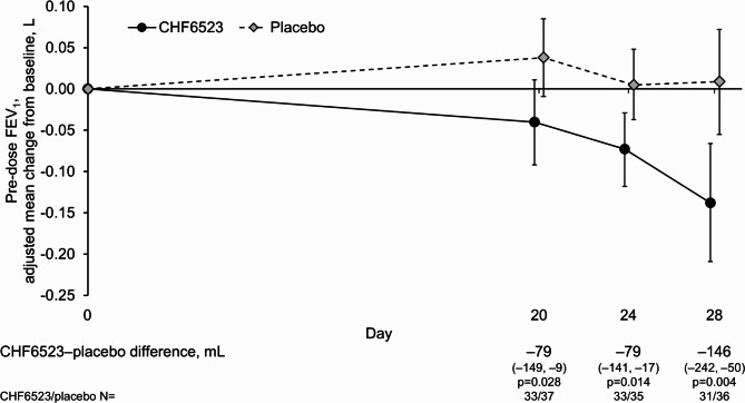 Results: CHF6523 plasma pharmacokinetics were characterised by an early maximum concentration (Cmax), reached 15 and 10 min after dosing on Days 1 and 28, respectively, followed by a rapid decline. Systemic exposure on Day 28 showed limited accumulation, with ratios < 1.6 for Cmax and area under the curve from 0 to 12 h post-dose, and with steady state achieved on Day 20. Target engagement was confirmed by a significant 29.7% reduction from baseline in induced sputum PIP3 (29.5% reduction vs. placebo; adjusted ratio 0.705 [0.580, 0.856]; p = 0.001), but this did not translate into an anti-inflammatory pharmacodynamic effect, as assessed through measures including biomarkers and multi-omics. Additionally, although CHF6523 was generally well-tolerated, 95.2% of patients reported cough as an adverse event, most mild to moderate and resolving within one-hour post-dose.