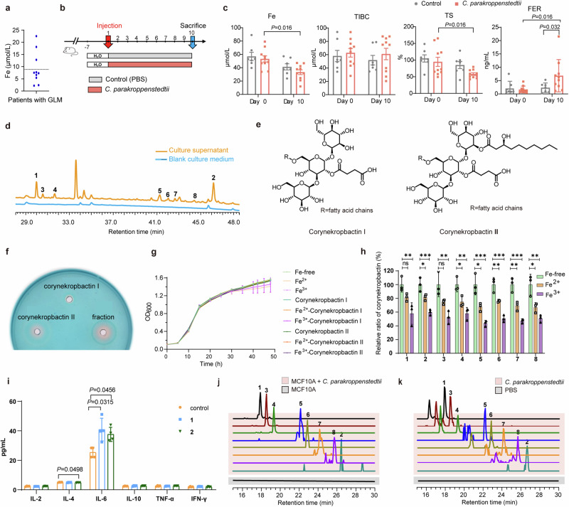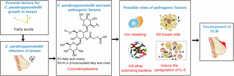 Granulomatous lobular mastitis (GLM) is a chronic idiopathic granulomatous mastitis of the mammary gland characterized by significant pain and a high propensity for recurrence, the incidence rate has gradually increased, and has become a serious breast disease that should not be ignored. GLM is highly suspected relative to microbial infections, especially those of Corynebacterium species; however, the mechanisms involved are unclear, and prevention and treatment are difficult. In this study, we demonstrated the pathogenicity of Corynebacterium parakroppenstedtii in GLM using Koch's postulates. Based on the drug sensitization results of C. parakroppenstedtii, and utilizing a retrospective study in conjunction with a comprehensive literature review, we suggested an efficacious, targeted antibiotic treatment strategy for GLM. Subsequently, we identified the pathogenic factor as a new type of glycolipid (named corynekropbactins) secreted by C. parakroppenstedtii. Corynekropbactins may chelate iron, cause the death of mammary cells and other mammary -gland-colonizing bacteria, and increase the levels of inflammatory cytokines. We further analyzed the prevalence of C. parakroppenstedtii infection in patients with GLM. Finally, we suggested that the lipophilicity of C. parakroppenstedtii may be associated with its infection route and proposed a possible model for the development of GLM. This research holds significant implications for the clinical diagnosis and therapeutic management of GLM, offering new insights into targeted treatment approaches.