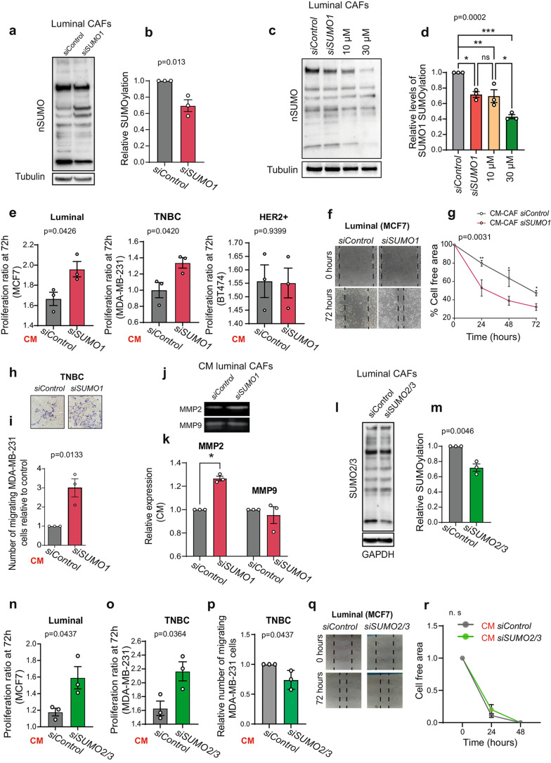 Methods: We used pharmacological and genetic approaches to analyse the functional crosstalk between breast tumor cells and CAFs. We treated breast CAFs with the SUMO1 inhibitor ginkgolic acid (GA) at two different concentrations and conditioned media was used to analyse the proliferation, migration, and invasion of breast cancer cells from different molecular subtypes. Additionally, we performed quantitative proteomics (SILAC) to study the differential signalling pathways expressed in CAFs treated with low or high concentrations of GA. We confirmed these results both in vitro and in vivo. Moreover, we used samples from metastatic breast cancer patients to evaluate the use of GA as a therapeutic strategy.