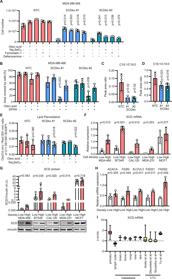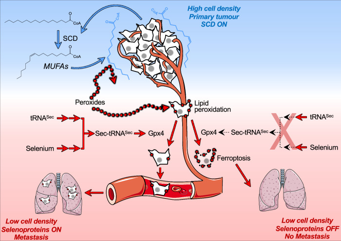 The limited availability of therapeutic options for patients with triple-negative breast cancer (TNBC) contributes to the high rate of metastatic recurrence and poor prognosis. Ferroptosis is a type of cell death caused by iron-dependent lipid peroxidation and counteracted by the antioxidant activity of the selenoprotein GPX4. Here, we show that TNBC cells secrete an anti-ferroptotic factor in the extracellular environment when cultured at high cell densities but are primed to ferroptosis when forming colonies at low density. We found that secretion of the anti-ferroptotic factors, identified as monounsaturated fatty acid (MUFA) containing lipids, and the vulnerability to ferroptosis of single cells depends on the low expression of stearyl-CoA desaturase (SCD) that is proportional to cell density. Finally, we show that the inhibition of Sec-tRNAsec biosynthesis, an essential step for selenoprotein production, causes ferroptosis and impairs the lung seeding of circulating TNBC cells that are no longer protected by the MUFA-rich environment of the primary tumour.