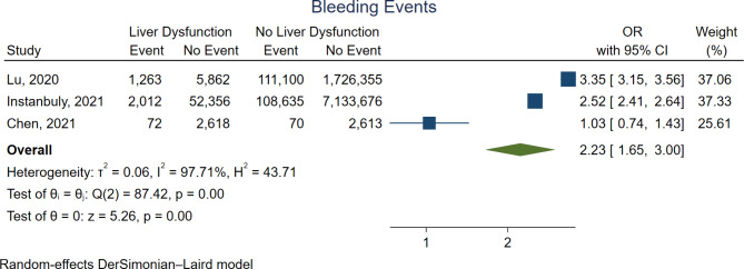 Results: Five studies were selected and the data from 10,710,317 patients were included in the final analysis. In comparison with the absence of liver dysfunction, patients with liver dysfunction were associated with higher short-term mortality (OR 2.97, 95%CI 1.23-7.18, p = 0.02), higher MACCE (OR 1.42, 95%CI 1.08-1.87, p = 0.01), and higher bleeding (OR 2.23, 95%CI 1.65-3.00, p < 0.01). There was no significant difference regarding acute kidney injury (OR 1.20, 95%CI 0.50-2.87, p = 0.69).