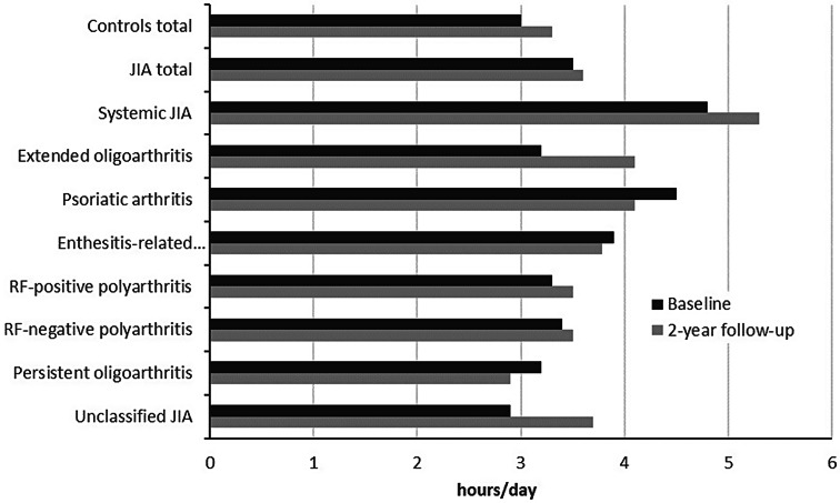 Background: Regular physical activity (PA) has been proven to help prevent non-communicable diseases and is beneficial for disease management in chronically ill populations. Physical inactivity and recreational screen-based media (SBM) use are related to poor health outcomes and common among youth. This study aimed to (1) investigate PA levels and recreational SBM use of adolescents with JIA over time and (2) compare these behaviours with those of their peers.