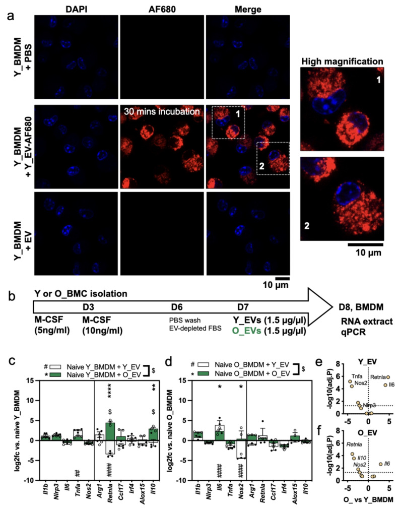 Results: In this study, plasma EVs from young (Y_EV) and aged (O_EV) mice were isolated and compared based on abundance, size, and miRNA cargo. Compared to some previous studies, we found relatively few differences in EV miRNA cargo between Y_EVs and O_EVs. Young and old EVs were then used to stimulate naïve BMDMs isolated from young (Y_BMDM) and aged (O_BMDM) mice. A panel of five "M1" and six "M2" macrophage markers were used to assess the degree of polarisation. Our results revealed differences in the immunomodulatory effects of Y_EVs and O_EVs in Y_BMDMs and O_BMDMs. Y_EVs induced less pro-inflammatory gene expression, while O_EVs exhibited a more varied impact, promoting both pro- and anti-inflammatory markers. However, neither EV population induced a clearly defined 'M1' or 'M2' macrophage phenotype. We also report that EVs elicited responses that differed markedly from those induced by whole plasma. Plasma from old mice had strong pro-inflammatory effects on Y_BMDMs, increasing Il1b, Nlrp3 and Tnfa. However, O_EVs did not have these effects, supporting current evidence that EVs are a separate component of circulating factors during ageing. More research is needed to elucidate specific factors involved in inflammageing processes.