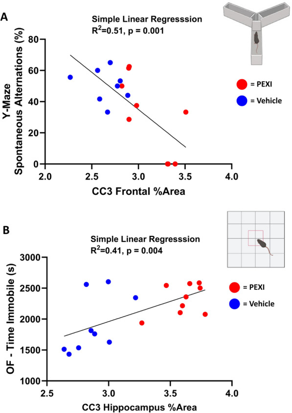 Results: Frontal/hippocampal neuronal CC3 levels were significantly higher in microglia depleted VILI mice compared to vehicle-treated VILI controls (p < 0.01, p < 0.01, respectively). These structural changes were accompanied by worse delirium-like behaviors in microglia depleted VILI mice compared to vehicle controls. Specifically, microglia depleted VILI mice demonstrated: (1) significantly increased time in the periphery of the Open Field (p = 0.01), (2) significantly increased coefficient of variation (p = 0.02), (3) trend towards reduced time in the open arms of the Elevated Plus Maze (p = 0.09), and (4) significantly decreased spontaneous alternations on Y-maze (p < 0.01). There was a significant inverse correlation between frontal CC3 and percent spontaneous alternations (R2 = 0.51, p < 0.01). Microglia repopulation showed a near-complete return to vehicle levels of delirium like-behaviors.