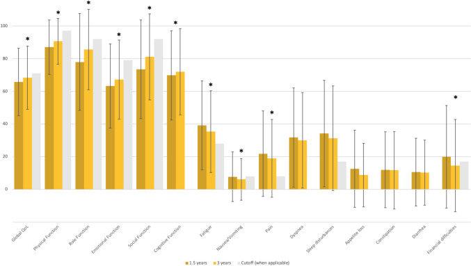 Results: HRQoL improvements over time were trivial to small. At both time points, a majority of respondents rated HRQoL levels indicating supportive care needs. At 1.5 years post-diagnosis, the risk of having support needs was lower among survivors with testicular cancer (compared to lymphoma) or university-level education, and higher among those on treatment (predominantly endocrine therapy). At 3 years post-diagnosis, when controlling for previous HRQoL scores, most correlations persisted, and poor self-rated household economy and chronic health conditions were additionally associated with supportive care needs.