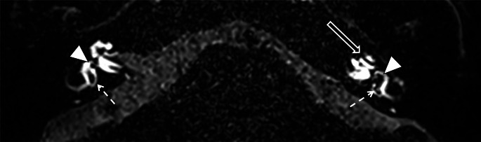 Materials and methods: We prospectively analyzed 3D3T FLAIR MRI of DMD and PMD patients. All of them underwent electrocochleography (EcoG), distortion-product otoacoustic emissions (DPOAEs), and videonystagmograhy (VNG). Amplitudes of summating potential (SP) and cochlear nerve action potential (AP) were measured on EcoG. DPOAE-phase was collected at 1 kHz for the 2f1-f2 DPOAE between sitting and laying position. A SP/AP ≥ 40% and a DPOAE phase-shift > 40° revealed pressure disruption.