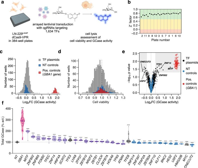 Mutations in GBA1 encoding the lysosomal enzyme β-glucocerebrosidase (GCase) are among the most prevalent genetic susceptibility factors for Parkinson's disease (PD), with 10-30% of carriers developing the disease. To identify genetic modifiers contributing to the incomplete penetrance, we examined the effect of 1634 human transcription factors (TFs) on GCase activity in lysates of an engineered human glioblastoma line homozygous for the pathogenic GBA1 L444P variant. Using an arrayed CRISPR activation library, we uncovered 11 TFs as regulators of GCase activity. Among these, activation of MITF and TFEC increased lysosomal GCase activity in live cells, while activation of ONECUT2 and USF2 decreased it. While MITF, TFEC, and USF2 affected GBA1 transcription, ONECUT2 might control GCase trafficking. The effects of MITF, TFEC, and USF2 on lysosomal GCase activity were reproducible in iPSC-derived neurons from PD patients. Our study provides a systematic approach to identifying modulators of GCase activity and deepens our understanding of the mechanisms regulating GCase.