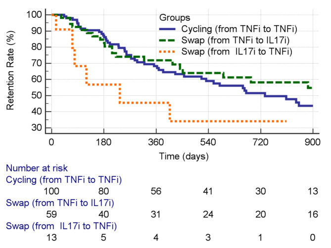 The availability of a number of bDMARDs with different mechanism of action increases potential treatment pathways in psoriatic arthritis (PsA). In clinical practice, following the failure of one bDMARD, it is normal to consider which options are the best for switching strategy. In most cases this choice involves IL17i and TNFi. The main aim of this study was to compare the effectiveness of cycling (from TNFi to another TNFi) and swapping (from TNFi to IL17i or vice versa) strategies. In this monocentric retrospective observational study, all PsA patients treated with TNFi or IL17i between January 2016 and January 2022 were enrolled. The prescriptions were clustered in one cycling group (CG), and two swap groups: from TNFi to IL17i (SG1) and from IL17i to TNFi (SG2). The Kaplan-Meier method and Cox regression models were applied to compare the drug retention rates and to identify factors affecting treatment persistence. A total of 122 patients were enrolled. The CG, SG1 and SG2 2-years retention rates were 51%, 58% and 34% (p = 0.1), respectively. SG1 strategy (HR 0.53; CI 0.31-0.89; p = 0.02), age (HR 0.98; CI 0.96-0.99; p = 0.003), Disease Activity PsA (HR 1.11; CI 1.08-1.13; p < 0.0001), year of switch (HR 1.78; CI 1.39-2.22; p < 0.0001) influenced the retention rate. The findings of this real-world study, even if burdened by bias related to its observational nature, support the hypothesis that in PsA patients swapping from TNFi to IL17i might be more effective than cycling TNFis.