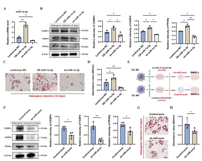 Conclusion: We demonstrated that exosomes derived from GC-M1 macrophages disrupt the balance between osteogenic and adipogenic differentiation in BMSCs, contributing to the pathogenesis of GA-ONFH. Inhibiting miR-1a-3p expression, both in vitro and in vivo, significantly mitigates the preferential adipogenic differentiation of BMSCs, thus slowing the progression of GA-ONFH. These findings provide new insights into the regulatory mechanisms underlying GA-ONFH and highlight potential therapeutic targets for intervention.
