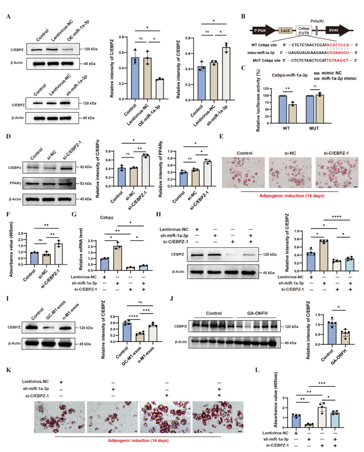 Results: In vivo, the colocalization of M1 macrophages and BMSCs was observed, and an increase in M1 macrophage numbers and a decrease in bone repair capabilities were further confirmed in both GA-ONFH patients and mouse models. Both n-M1 and GC-M1 were identified as contributors to the inhibition of osteogenic differentiation in BMSCs to a certain extent via exosome secretion. More importantly, exosomes derived from GC-M1 macrophages exhibited a heightened capacity to regulate the adipogenic differentiation of BMSCs, which was mediated by miR-1a-3p. In vivo and in vitro, miR-1a-3p promoted the adipogenic differentiation of BMSCs by targeting Cebpz and played an important role in the onset and progression of GA-ONFH.
