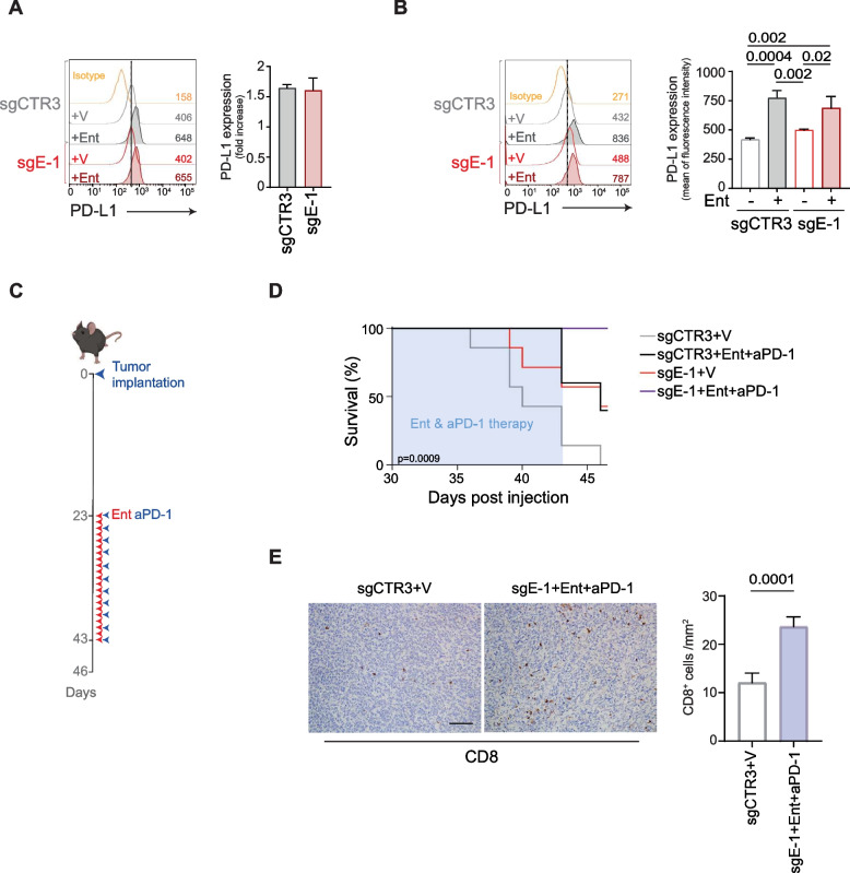 Results: We found that inhibition of ERAP1 makes 9464D cells more susceptible to immune cell-mediated killing by increasing both the recall and activation of CD4+ and CD8+ T cells and NK cells. Treatment with entinostat induces the expression of MHC class I and PD-L1 molecules in 9464D both in vitro and in vivo. This results in pronounced changes in the immunopeptidome induced by ERAP1 inhibition, but also restrains the growth of ERAP1 KO tumors in vivo by remodelling the tumor-infiltrating T-cell compartment. Interestingly, the absence of ERAP1 in combination with entinostat and PD-1 blockade overcomes resistance to PD-1 immunotherapy and increases host survival.