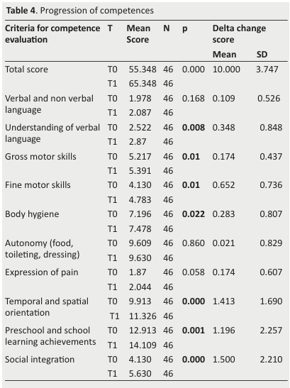 Results: Mean sub scores (externalization/internalization) of CBCL decreased significantly (p<0.002). Competences were significantly improved in the following domains: understanding of verbal language, gross and fine motor skills, body hygiene, spatial and temporal orientation, preschool and school learning achievements and social integration.