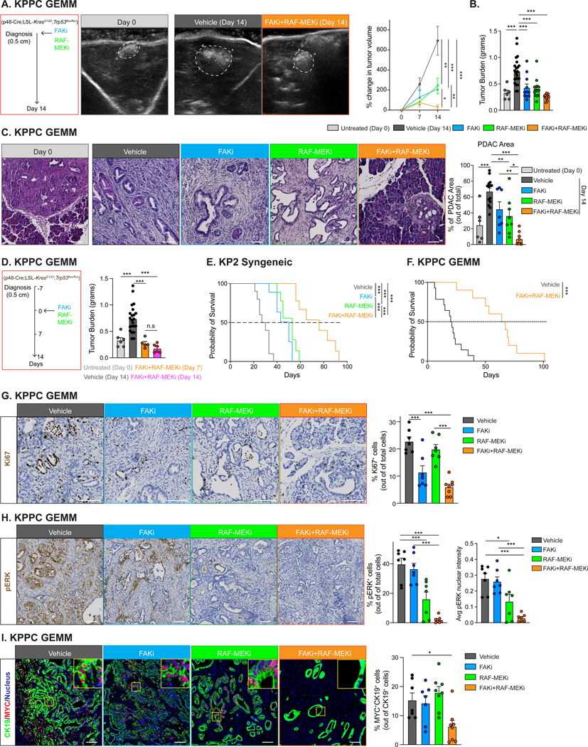 Pancreatic ductal adenocarcinoma (PDAC) is a lethal malignancy that is often resistant to therapy. An immune suppressive tumor microenvironment (TME) and oncogenic mutations in KRAS have both been implicated as drivers of resistance to therapy. Mitogen-activated protein kinase (MAPK) inhibition has not yet shown clinical efficacy, likely because of rapid acquisition of tumor-intrinsic resistance. However, the unique PDAC TME may also be a driver of resistance. We found that long-term focal adhesion kinase (FAK) inhibitor treatment led to hyperactivation of the RAS/MAPK pathway in PDAC cells in mouse models and tissues from patients with PDAC. Concomitant inhibition of both FAK (with VS-4718) and rapidly accelerated fibrosarcoma and MAPK kinase (RAF-MEK) (with avutometinib) induced tumor growth inhibition and increased survival across multiple PDAC mouse models. In the TME, cancer-associated fibroblasts (CAFs) impaired the down-regulation of MYC by RAF-MEK inhibition in PDAC cells, resulting in resistance. By contrast, FAK inhibition reprogramed CAFs to suppress the production of FGF1, which can drive resistance to RAF-MEK inhibition. The addition of chemotherapy to combined FAK and RAF-MEK inhibition led to tumor regression, a decrease in liver metastasis, and improved survival in KRAS-driven PDAC mouse models. Combination of FAK and RAF-MEK inhibition alone improved antitumor immunity and priming of T cell responses in response to chemotherapy. These findings provided the rationale for an ongoing clinical trial evaluating the efficacy of avutometinib and defactinib in combination with gemcitabine and nab-paclitaxel in patients with PDAC and may suggest further paths for combined stromal and tumor-targeting therapies.
