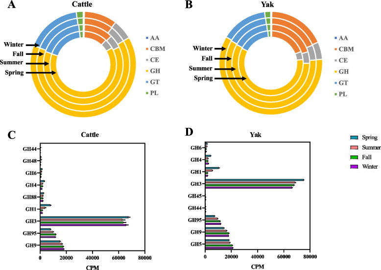 Results: Rumen fermentation characteristics and pH significantly shifted across seasons in both cattle and yak, but the patterns differed between the two ruminant species. Ruminal enzyme activity varied with season, and production of xylanase and cellulase was greater in yak compared to cattle in both fall and winter. The rumen bacterial community varied with season in both yak and cattle, with higher alpha diversity and similarity (beta diversity) in yak than cattle. The diversity indices of eukaryotic community did not change with season in both ruminant species, but higher similarity was observed in yak. In addition, the similarity of rumen microbiome functional community was higher in yak than cattle across seasons. Moreover, yak rumen microbiome encoded more genes (GH2 and GH3) related to cellulose and hemicellulose degradation compared to cattle, and a new enzyme family (GH160) gene involved in oligosaccharides was uniquely detected in yak rumen. The season affected microbiome attenuation and buffering values (stability), with higher buffering value in yak rumen microbiome than cattle. Positive correlations between antimicrobial resistance gene (dfrF) and CAZyme family (GH113) and microbiome stability were identified in yak, but such relationship was negatively correlated in cattle.