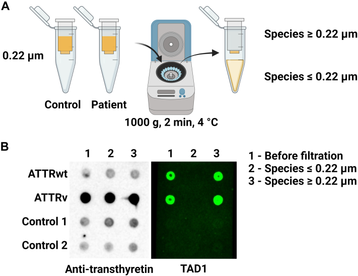 This work was supported by the American Heart Association Career Development Award (847236) (to Dr Saelices), the National Institutes of Health (NIH) Director's New Innovator Award (DP2-HL163810-01) (to Dr Saelices), the Welch Foundation Research Award (I-2121-20220331) (to Dr Saelices), the NIH R01 (R01-HL160892) (to Dr Grodin), and the NIH grant 1S10OD021685-01A1 received by the Electron Microscopy Core of UTSW. R. Pedretti and Dr Saelices are inventors on a patent application (Provisional Patent Application 63/352,521) submitted by the University of Texas Southwestern Medical Center that covers the composition and structure-based diagnostic methods related to cardiac ATTR amyloidosis. Dr Grodin has received honoraria for scientific consulting from Alnylam, Eidos/BridgeBio, Intellia, Pfizer, Alexion, AstraZeneca, and Tenax Therapeutics; and has received research funding from Pfizer, Eidos/BridgeBio, the Texas Health Resources Clinical Scholars fund, and the National Heart, Lung, and Blood Institute. Dr Masri has received research funding from Pfizer, Ionis/Akcea, Attralus, and Cytokinetics; and has received consulting fees from Cytokinetics, Bristol Myers Squibb, Eidos, Pfizer, Ionis, Lexicon, Alnylam, Attralus, Haya, Intellia, BioMarin, and Tenaya. Dr Saelices has received honoraria for scientific consulting for Intellia and Attralus; and has served as a member of the Advisory Board of Alexion. All other authors have reported they have no relationships relevant to the contents of this paper to disclose.PerspectivesCOMPETENCY IN MEDICAL KNOWLEDGE: ATTR amyloidosis is an under-recognized cause of heart failure due to lack of tools that can effectively distinguish between native and amyloidogenic transthyretin. Using structures of mature ATTR fibrils derived from patient tissue, we have developed a novel detection probe that addresses this unmet need. This probe not only binds ATTR fibrils with high affinity, but also large ATTR aggregates in plasma of patients with ATTR amyloidosis. TRANSLATIONAL OUTLOOK: Combined with previous results, our data unveils a novel biomarker for cardiac ATTR amyloidosis that has the potential to be exploited as a novel diagnostic and/or therapeutic target. Our results may be leveraged to develop a screening tool using blood samples to identify disease onset earlier than the current diagnostic standard. This will enable timely treatment, improve patient prognosis, and reduce burden on the health care system.