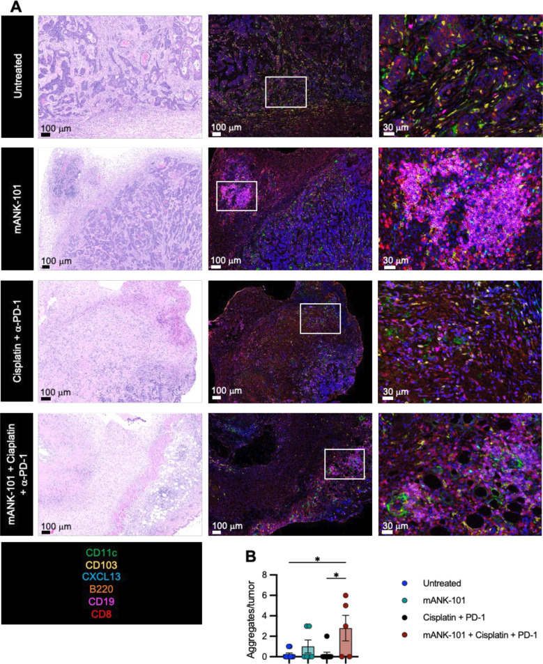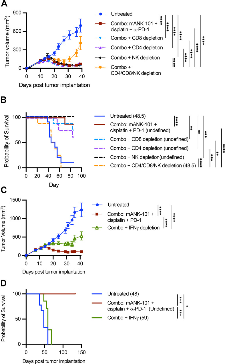 Results: In the MOC1 and MOC2 models, combination therapy with mANK-101, cisplatin, and α-PD-1 resulted in superior tumor growth inhibition and resulted in the highest rate of tumor-free survival when compared with treatment cohorts that received mANK-101 monotherapy or SOC treatment with α-PD-1 plus cisplatin. Furthermore, the combination therapy protected against tumor re-growth on rechallenge and controlled the growth of distal tumors. The improved therapeutic effect was associated with increased CD8+ T-cell recruitment, increased CD8+ and CD4+ activity, and repolarization of the macrophage population from M2 to M1 at the tumor site. Elevated and prolonged interferon-γ expression is central to the antitumor activity mediated by the combination therapy. In addition, the combination therapy with mANK-101+cisplatin+α-PD-1 induced the formation of tertiary lymphoid structure-like immune aggregates in the peritumoral space.