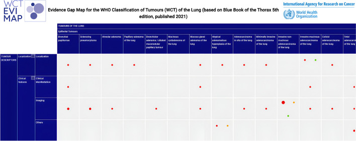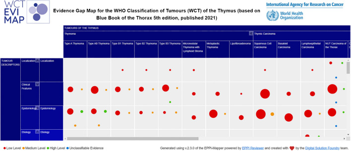 The WHO Classification of Tumours (WCT) guides cancer diagnosis, treatment, and research. However, research evidence in pathology continuously changes, and new evidence emerges. Correct assessment of evidence in the WCT 5th edition (WCT-5) and identification of high level of evidence (LOE) studies based on study design are needed to improve future editions. We aimed at producing exploratory evidence maps for WCT-5 Thoracic Tumours, specifically lung and thymus tumors. We extracted citations from WCT-5, and imported and coded them in EPPI-Reviewer. The maps were plotted using EPPI-Mapper. Maps displayed tumor types (columns), descriptors (rows), and LOE (bubbles using a four-color code). We included 1434 studies addressing 51 lung, and 677 studies addressing 25 thymus tumor types from WCT-5 thoracic tumours volume. Overall, 87.7% (n = 1257) and 80.8% (n = 547) references were low, and 4.1% (n = 59) and 2.2% (n = 15) high LOE for lung and thymus tumors, respectively. Invasive non-mucinous adenocarcinoma of the lung (n = 215; 15.0%) and squamous cell carcinoma of the thymus (n = 93; 13.7%) presented the highest number of references. High LOE was observed for colloid adenocarcinoma of the lung (n = 11; 18.2%) and type AB thymoma (n = 4; 1.4%). Tumor descriptors with the highest number of citations were prognosis and prediction (n = 273; 19.0%) for lung, and epidemiology (n = 186; 28.0%) for thymus tumors. LOE was generally low for lung and thymus tumors. This study represents an initial step in the WCT Evidence Gap Map (WCT-EVI-MAP) project for mapping references in WCT-5 for all tumor types to inform future WCT editions.