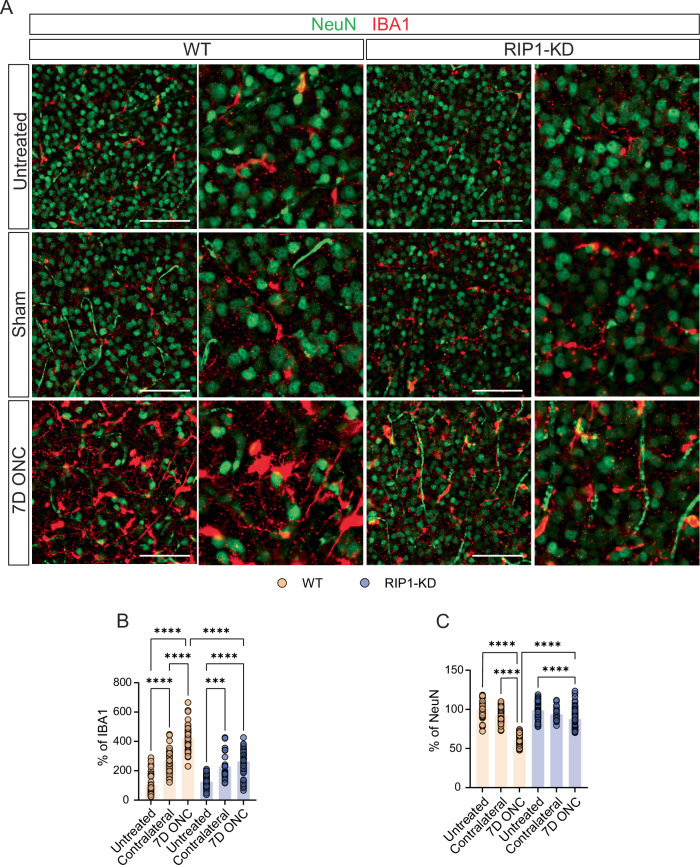 Receptor-interacting protein 1 (RIP1, RIPK1) is a critical mediator of multiple signaling pathways that promote inflammatory responses and cell death. The kinase activity of RIP1 contributes to the pathogenesis of a number of inflammatory and neurodegenerative diseases. However, the role of RIP1 in retinopathies remains unclear. This study demonstrates that RIP1 inhibition protects retinal ganglion cells (RGCs) in preclinical glaucoma models. Genetic inactivation of RIP1 improves RGC survival and preserves retinal function in the preclinical glaucoma models of optic nerve crush (ONC) and ischemia-reperfusion injury (IRI). In addition, the involvement of necroptosis in ONC and IRI glaucoma models was examined by utilizing RIP1 kinase-dead (RIP1-KD), RIP3 knockout (RIP3-KO), and MLKL knockout (MLKL-KO) mice. The number of RGCs, retinal thickness, and visual acuity were rescued in RIP1-kinase-dead (RIP1-KD) mice in both models, while wild-type (WT) mice experienced significant retinal thinning, RGC loss, and vision impairment. RIP3-KO and MLKL-KO mice showed moderate protective effects in the IRI model and limited in the ONC model. Furthermore, we confirmed that a glaucoma causative mutation in optineurin, OPTN-E50K, sensitizes cells to RIP1-mediated inflammatory cell death. RIP1 inhibition reduces RGC death and axonal degeneration following IRI in mice expressing OPTN-WT and OPTN-E50K variant mice. We demonstrate that RIP1 inactivation suppressed microglial infiltration in the RGC layer following glaucomatous damage. Finally, this study highlights that human glaucomatous retinas exhibit elevated levels of TNF and RIP3 mRNA and microglia infiltration, thus demonstrating the role of neuroinflammation in glaucoma pathogenesis. Altogether, these data indicate that RIP1 plays an important role in modulating neuroinflammation and that inhibiting RIP1 activity may provide a neuroprotective therapy for glaucoma.