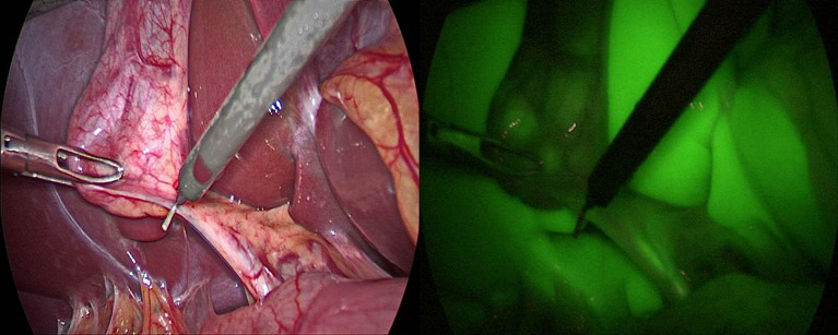 Conclusion: The current study shows that for both administration methods, ICG-fluorescence cholangiography can be useful in identifying the extrahepatic biliary anatomy during Calot's triangle dissection. By avoiding hepatic fluorescence, the transhepatic IC-ICG route can increase the bile duct-to-liver contrast with less expense and no risk of hypersensitivity reactions than the intravenous ICG injection method. We recommend to use both techniques in case of acute cholecystitis with cystic duct obstruction. In cases of liver cirrhosis, we recommend transhepatic IC-ICG as IV-ICG is limited.
