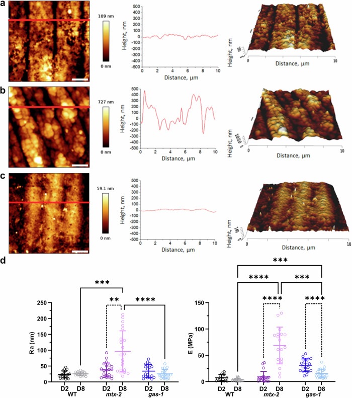 MandibuloAcral Dysplasia associated to MTX2 gene (MADaM) is a recently described progeroid syndrome (accelerated aging disease) whose clinical manifestations include skin abnormalities, growth retardation, and cardiovascular diseases. We previously proposed that mtx-2-deficient C. elegans could be used as a model for MADaM and to support this, we present here our comprehensive phenotypic characterization of these worms using atomic force microscopy (AFM), transcriptomic, and oxygen consumption rate analyses. AFM analysis showed that young mtx-2-less worms had a significantly rougher, less elastic cuticle which becomes significantly rougher and less elastic as they age, and abnormal mitochondrial morphology. mtx-2 C. elegans displayed slightly delayed development, decreased pharyngeal pumping, significantly reduced mitochondrial respiratory capacities, and transcriptomic analysis identified perturbations in the aging, TOR, and WNT-signaling pathways. The phenotypic characteristics of mtx-2 worms shown here are analogous to many of the human clinical presentations of MADaM and we believe this validates their use as a model which will allow us to uncover the molecular details of the disease and develop new therapeutics and treatments.