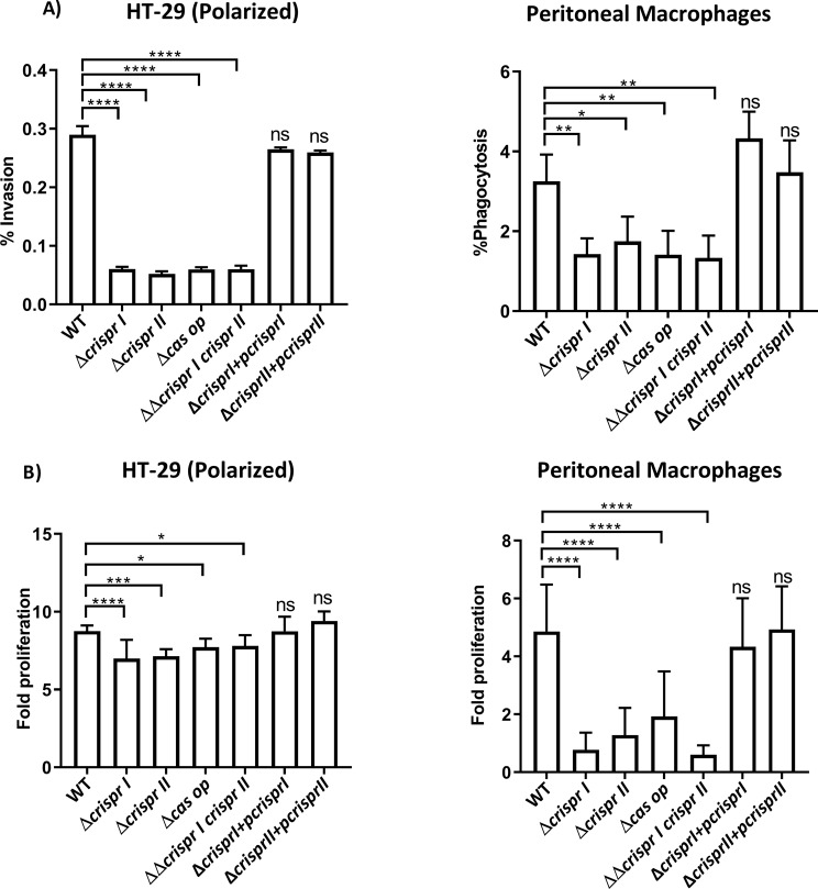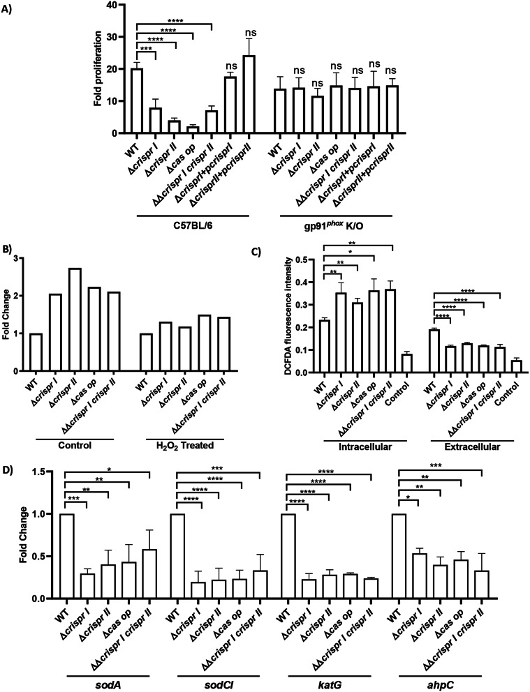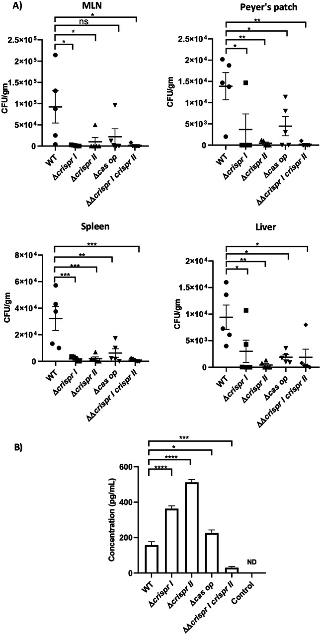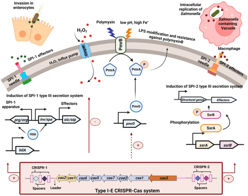 Results: Our study demonstrates invasion and proliferation defects of CRISPR-Cas knockout strains in intestinal epithelial cells and macrophages owing to the repression of invasion and virulence genes. However, proliferation defects were not observed in the Gp91phox-/- macrophages, suggesting the system's role in the pathogens' antioxidant defense. We deduced that the CRISPR-Cas system positively regulates H2O2 importer (OmpW), catalase (katG), peroxidase (ahpC), and superoxide dismutase (soda and sodCI), thereby protecting the cells from oxidative radicals. The knockout strains were attenuated in in-vivo infection models (Caenorhabditis elegans and BALB/c mice) due to hypersensitivity against antimicrobial peptides, complement proteins, and oxidative stress. The attenuation in virulence was attributed to the suppression of LPS modifying (pmr) genes, antioxidant genes, master regulators, and effectors of the SPI-1 (invasion) and SPI-2 (proliferation) islands in knockout strains. The regulation could be attributed to the partial complementarity of the CRISPR spacers with these genes.