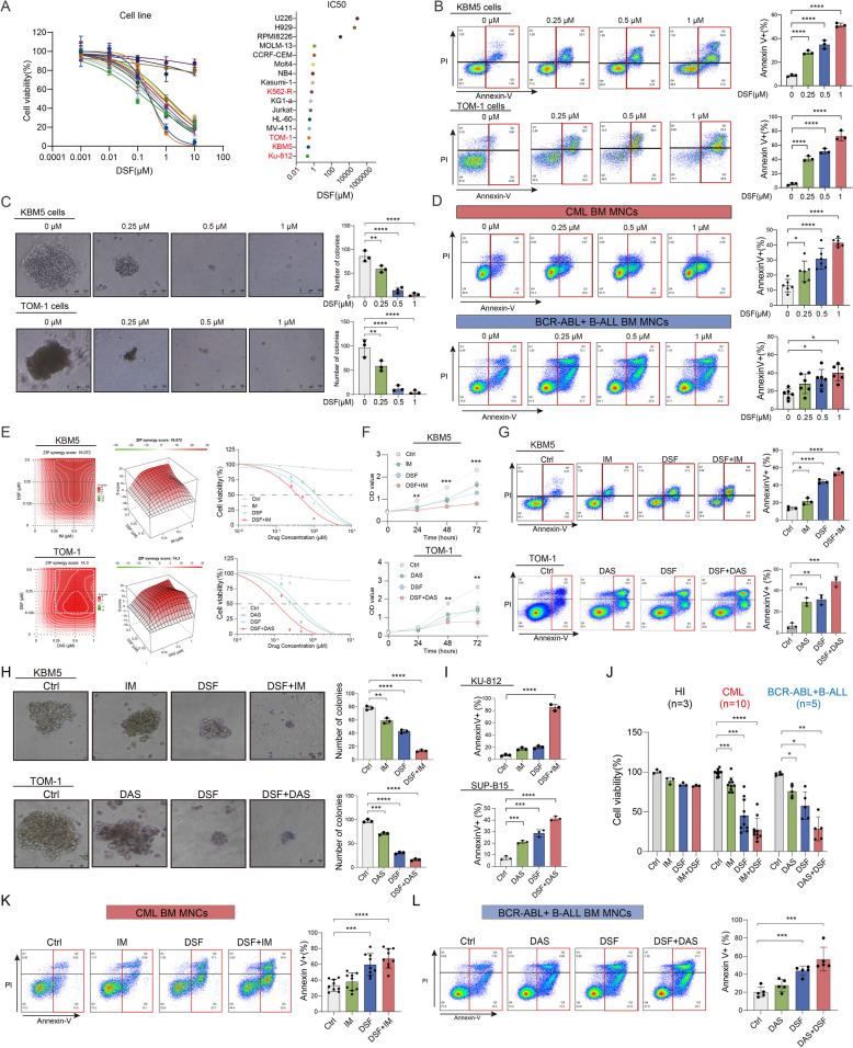 Methods: In this study, we demonstrated that Disulfiram (DSF) induces ferroptosis to synergize with TKIs in inhibiting BCR-ABL+ cells, particularly targeting resistant cells and LSCs, using cell models, mouse models, and primary cells from patients. We elucidated the mechanism by which DSF promotes GPX4 degradation to induce ferroptosis through immunofluorescence, co-immunoprecipitation (CO-IP), RNA sequencing, lipid peroxidation assays, and rescue experiments.
