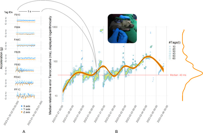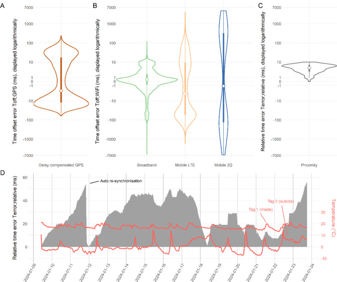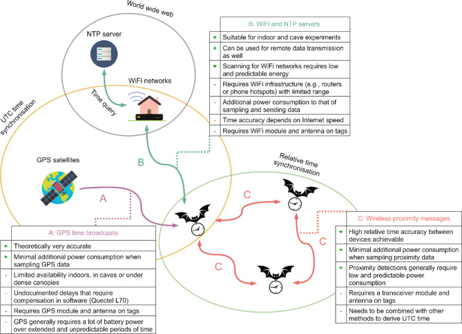 Time-synchronised data streams from bio-loggers are becoming increasingly important for analysing and interpreting intricate animal behaviour including split-second decision making, group dynamics, and collective responses to environmental conditions. With the increased use of AI-based approaches for behaviour classification, time synchronisation between recording systems is becoming an essential challenge. Current solutions in bio-logging rely on manually removing time errors during post processing, which is complex and typically does not achieve sub-second timing accuracies.We first introduce an error model to quantify time errors, then optimise three wireless methods for automated onboard time (re)synchronisation on bio-loggers (GPS, WiFi, proximity messages). The methods can be combined as required and, when coupled with a state-of-the-art real time clock, facilitate accurate time annotations for all types of bio-logging data without need for post processing. We analyse time accuracy of our optimised methods in stationary tests and in a case study on 99 Egyptian fruit bats (Rousettus aegyptiacus). Based on the results, we offer recommendations for projects that require high time synchrony.During stationary tests, our low power synchronisation methods achieved median time accuracies of 2.72 / 0.43 ms (GPS / WiFi), compared to UTC time, and relative median time accuracies of 5 ms between tags (wireless proximity messages). In our case study with bats, we achieved a median relative time accuracy of 40 ms between tags throughout the entire 10-day duration of tag deployment. Using only one automated resynchronisation per day, permanent UTC time accuracies of ≤ 185 ms can be guaranteed in 95% of cases over a wide temperature range between 0 and 50 °C. Accurate timekeeping required a minimal battery capacity, operating in the nano- to microwatt range.Time measurements on bio-loggers, similar to other forms of sensor-derived data, are prone to errors and so far received little scientific attention. Our combinable methods offer a means to quantify time errors and autonomously correct them at the source (i.e., on bio-loggers). This approach facilitates sub-second comparisons of simultaneously recorded time series data across multiple individuals and off-animal devices such as cameras or weather stations. Through automated resynchronisations on bio-loggers, long-term sub-second accurate timestamps become feasible, even for life-time studies on animals. We contend that our methods have potential to greatly enhance the quality of ecological data, thereby improving scientific conclusions.
