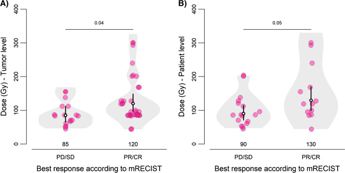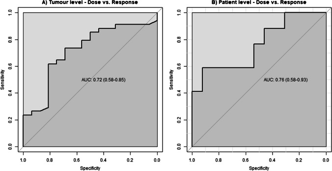 Methods: Thirty-one patients with hepatocellular carcinoma were included in the HEPAR Primary study (NCT03379844, registered on December 20th, 2017) and underwent 166Ho-microspheres radioembolisation. Linear mixed models assessed the association between tumour absorbed doses and response based on mRECIST both on tumour and patient level. Preliminary tumour absorbed dose thresholds were estimated based on predictive value. Linear regression models assessed the association between non-tumour absorbed dose and Common Terminology Criteria for Adverse Events version 4.03.