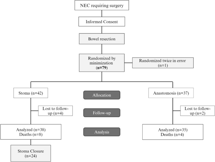 Purpose: The STAT trial is a multicenter randomized controlled trial in 12 centers worldwide aiming to determine the most effective operation for neonates with necrotizing enterocolitis (NEC) requiring intestinal resection: stoma formation (ST) or primary anastomosis (PA).