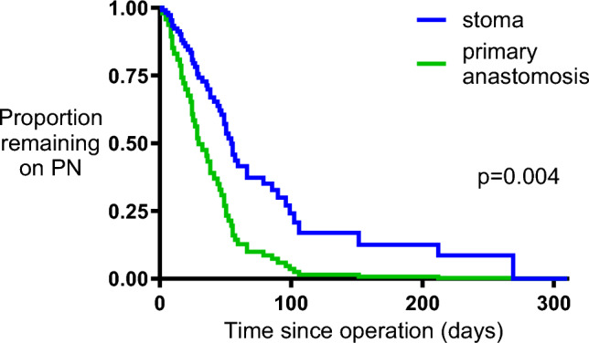 Results: Eighty patients were recruited from 2010 to 2019. Infants undergoing anastomosis finished PN significantly earlier than patients undergoing stoma (hazard ratio PA vs. ST 2.38, 95% CI 1.36-4.12 p = 0.004). There was no difference in mortality between the two groups (PA 4/35 vs. ST 8/38 p = 0.35) or in the rate of complications requiring further unplanned operations (p = n.s.). Multiple intestinal complications were more frequent in the stoma group compared to the anastomosis group (ST 12/26 vs. PA 5/31, p = 0.02, Fisher's Exact test).