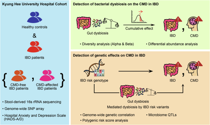 The high prevalence of comorbid mental disorders (CMDs) in patients with inflammatory bowel disease (IBD) is well-documented. This study delves into the intricate CMD-IBD relationship through comprehensive analyses using human variants, gut microbiome, and anxiety/depression estimates from a cohort of 507 IBD patients and 75 controls. Notably, patients with IBD, especially those with CMD, exhibited lower diversity than controls. We identified 106 differentially abundant taxa (DATs) in IBD patients compared to controls and 21 DATs distinguishing CMD-affected from CMD-free IBD patients. Microbial IBD-risk scores, reflecting an individual's microbial burden for IBD, revealed a significant enrichment of IBD-risk signatures in CMD-affected patients compared to CMD-free patients. Additionally, there was an IBD-risk variant potentially regulating the abundance of an IBD/CMD-associated DAT, suggesting an interplay between IBD-risk variants and dysbiosis in CMD. Our investigation underscores the pivotal role of IBD-associated gut dysbiosis in predisposing IBD patients to CMD, partially through genetic variant-mediated mechanisms.
