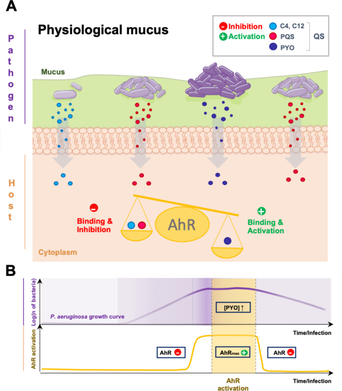 P. aeruginosa employs specific quorum sensing (QS) mechanisms to orchestrate biofilm formation, enhancing resistance to host defences. In physiological conditions, QS molecules permeate the lung environment and cellular membrane to reach the cytoplasmic Aryl Hydrocarbon Receptor (AhR) that is pivotal for activating the immune response against infection. In pathological conditions like cystic fibrosis (CF) this interkingdom communication is altered, favouring P. aeruginosa persistence and chronic infection. Here, we aim to investigate the molecular journey of QS molecules from CF-like environments to the cytoplasm by quantifying via HPLC-MS the permeability of selected QS molecules (quinolones, lactones, and phenazines) through in vitro models of the two main biological lung barriers: CF-mucus and cellular membrane. While QS molecules not activating AhR exhibit intermediate permeability through the cellular membrane model (PAMPA) (1.0-4.0 × 10-6 cm/s), the AhR-activating molecule (pyocyanin) shows significantly higher permeability (8.6 ± 1.4 × 10-6 cm/s). Importantly, combining the CF mucus model with PAMPA induces a 50% decrease in pyocyanin permeability, indicating a strong mucus-shielding effect with pathological implications in infection eradication. This study underscores the importance of quantitatively describing the AhR-active bacterial molecules, even in vitro, to offer new perspectives for understanding P. aeruginosa virulence mechanisms and for proposing new antibacterial therapeutic approaches.