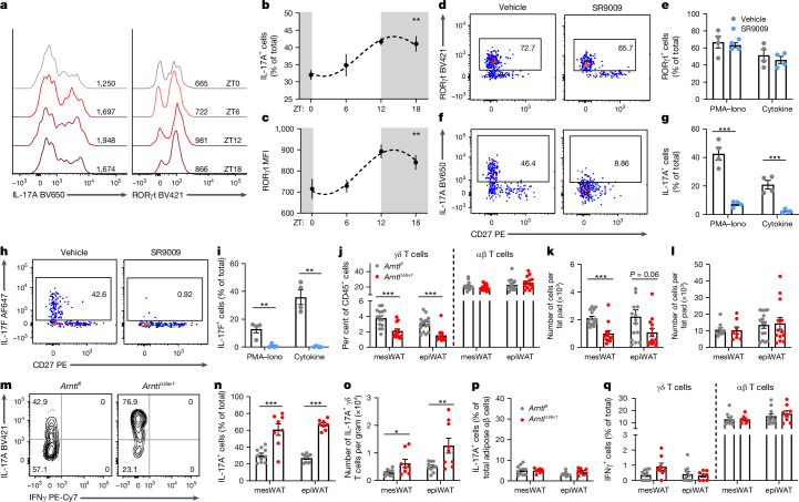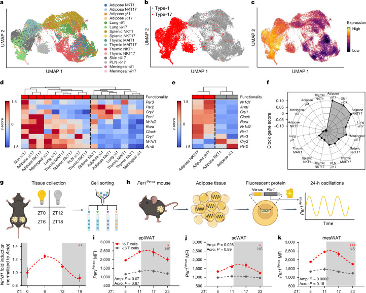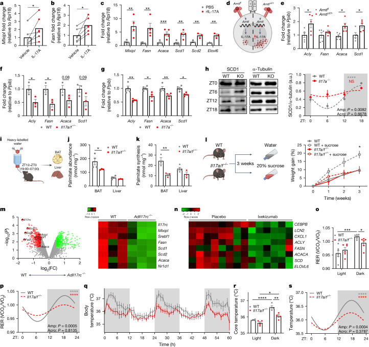 The circadian rhythm of the immune system helps to protect against pathogens1-3; however, the role of circadian rhythms in immune homeostasis is less well understood. Innate T cells are tissue-resident lymphocytes with key roles in tissue homeostasis4-7. Here we use single-cell RNA sequencing, a molecular-clock reporter and genetic manipulations to show that innate IL-17-producing T cells-including γδ T cells, invariant natural killer T cells and mucosal-associated invariant T cells-are enriched for molecular-clock genes compared with their IFNγ-producing counterparts. We reveal that IL-17-producing γδ (γδ17) T cells, in particular, rely on the molecular clock to maintain adipose tissue homeostasis, and exhibit a robust circadian rhythm for RORγt and IL-17A across adipose depots, which peaks at night. In mice, loss of the molecular clock in the CD45 compartment (Bmal1∆Vav1) affects the production of IL-17 by adipose γδ17 T cells, but not cytokine production by αβ or IFNγ-producing γδ (γδIFNγ) T cells. Circadian IL-17 is essential for de novo lipogenesis in adipose tissue, and mice with an adipocyte-specific deficiency in IL-17 receptor C (IL-17RC) have defects in de novo lipogenesis. Whole-body metabolic analysis in vivo shows that Il17a-/-Il17f-/- mice (which lack expression of IL-17A and IL-17F) have defects in their circadian rhythm for de novo lipogenesis, which results in disruptions to their whole-body metabolic rhythm and core-body-temperature rhythm. This study identifies a crucial role for IL-17 in whole-body metabolic homeostasis and shows that de novo lipogenesis is a major target of IL-17.