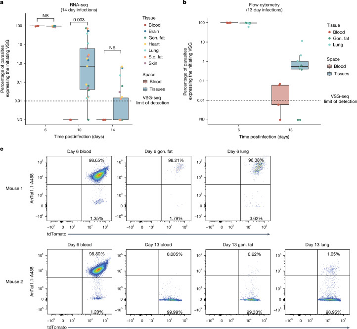 The protozoan parasite Trypanosoma brucei evades clearance by the host immune system through antigenic variation of its dense variant surface glycoprotein (VSG) coat, periodically 'switching' expression of the VSG using a large genomic repertoire of VSG-encoding genes1-6. Recent studies of antigenic variation in vivo have focused near exclusively on parasites in the bloodstream6-8, but research has shown that many, if not most, parasites reside in the interstitial spaces of tissues9-13. We sought to explore the dynamics of antigenic variation in extravascular parasite populations using VSG-seq7, a high-throughput sequencing approach for profiling VSGs expressed in populations of T. brucei. Here we show that tissues, not the blood, are the primary reservoir of antigenic diversity during both needle- and tsetse bite-initiated T. brucei infections, with more than 75% of VSGs found exclusively within extravascular spaces. We found that this increased diversity is correlated with slower parasite clearance in tissue spaces. Together, these data support a model in which the slower immune response in extravascular spaces provides more time to generate the antigenic diversity needed to maintain a chronic infection. Our findings reveal the important role that extravascular spaces can have in pathogen diversification.