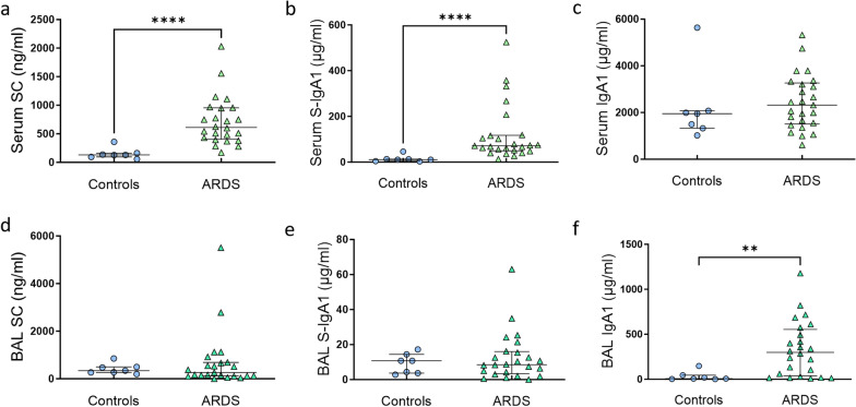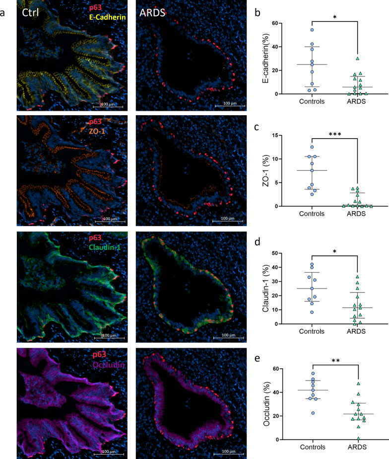 Results: Compared to controls, airways of ARDS were characterized by increased epithelial denudation (p = 0.0003) and diffuse epithelial infiltration by neutrophils (p = 0.0005). Quantitative evaluation of multiplex fluorescence immunostaining revealed a loss of ciliated cells (p = 0.0317) a trend towards decreased goblet cells (p = 0.056), and no change regarding cell progenitors (basal and club cells), indicating altered mucociliary differentiation. Increased epithelial permeability was also shown in ARDS with a significant decrease of tight (p < 0.0001) and adherens (p = 0.025) junctional proteins. Additionally, we observed a significant decrease of the expression of pIgR, (p < 0.0001), indicating impaired mucosal IgA immunity. Serum concentrations of secretory component (SC) and S-IgA were increased in ARDS (both p < 0.0001), along other lung-derived proteins (CC16, SP-D, sRAGE). However, their BALF concentrations remained unchanged, suggesting a spillover of airway and alveolar proteins through a damaged AE.