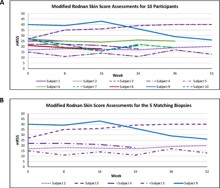Results: Only ten patients were enrolled because the sponsor terminated the trial early. Median, interquartile range (IQR) for mRSS change (0-52 weeks) for the five participants with paired biopsies was - 2.5 (-11-7.5), and for the ten participants was - 2 (-9-7.5). The correlation between Fibrosis Score and mRSS was R = 0.3; p = 0.674. Per 1-unit mRSS change (0-52W), histologic parameters with the greatest associated changes were (OR, p-value): telangiectasia (2.01, 0.001), perivascular CD3+ (1.03, 0.015), and % of CD8 + among CD3+ (1.08, 0.031). Likewise, per 1-unit Fibrosis Score change, parameters with greatest changes were (OR, p-value): hyalinized collagen (1.1, < 0.001), subcutaneous (SC) fat loss (1.47, < 0.001), thickened intima (1.21, 0.005), and eccrine entrapment (1.14, 0.046).