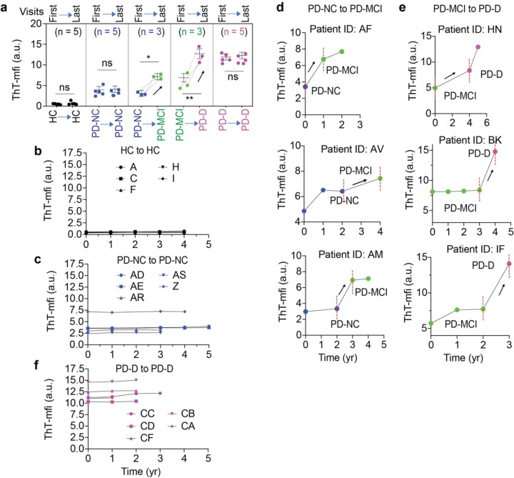 α-Synuclein (α-syn) strains can serve as discriminators between Parkinson's disease (PD) from other α-synucleinopathies. The relationship between α-syn strain dynamics and clinical performance as patients transition from normal cognition (NC) to cognitive impairment (CI) is not known. Here, we show that the biophysical properties and neurotoxicity of α-syn strains change as PD cognitive status transitions from NC to mild cognitive impairment (PD-MCI) and dementia (PD-D). Both cross-sectional and longitudinal analyses reveal distinct α-syn strains in PD patients correlating to their level of cognitive impairment. This study presents evidence that individuals with PD have different α-syn strains that change in accordance with their cognitive status and highlights the potential of α-syn strain dynamics to guide future diagnosis, management, and stratification of PD patients.