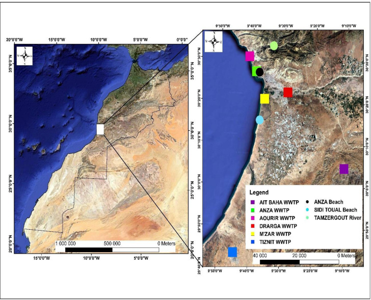 Water scarcity has evolved into a pressing global issue, significantly impacting numerous regions worldwide. The use of treated wastewater stands out as a promising solution to this problem. However, the proliferation of various contaminants, primarily Antimicrobial Resistance Genes (ARGs), poses a significant challenge to its safe and sustainable use. In this study, we assessed the composition and abundance of 373 ARGs, corresponding to 31 different classes of antibiotics, in six wastewater treatment plants (WWTP) in Agadir city of Morocco. Influent and effluent samples were collected during the months of February and July in 2020, in addition to samples from the Atlantic Ocean. In total, 223 ARGs were uncovered, highlighting in particular resistance to aminoglycoside, macrolide lincosamide, beta-lactamase, chloramphenicol, sulfonamide, tetracycline, and other antibiotics. The mechanisms of action of these ARGs were mainly antibiotic inactivation, antibiotic target alteration, efflux pump and cellular protection. Mobile genetic elements (MGEs) were detected at high levels their co-occurrence with ARGs highlights their involvement in the acquisition and transmission of ARGs in microbial communities through horizontal gene transfer. While many wastewater treatment methods effectively reduce a large proportion of gene material and pathogens, a substantial fraction of ARGs and other contaminants persist in treated wastewater. This persistence poses potential risks to both human health and the environment, warranting the need of more effective treatment strategies.