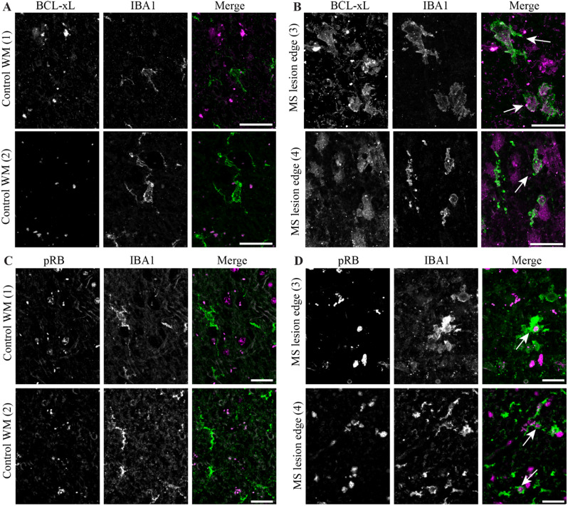 Results: A single-cell analysis of brain tissue from mice subjected to experimental autoimmune encephalomyelitis (EAE), a mouse model of CNS inflammation that models aspects of multiple sclerosis (MS), identified microglia with a strong transcriptional signature of senescence including the presence of BCL2-family gene transcripts. Microglia expressing Bcl2l1 had higher expression of pro-inflammatory and senescence associated genes than their Bcl2l1 negative counterparts in EAE, suggesting they may exacerbate inflammation. Notably, in human single-nucleus sequencing from MS, BCL2L1 positive microglia were enriched in lesions with active inflammatory pathology, and likewise demonstrated increased expression of immune genes suggesting they may be proinflammatory and contribute to disease processes in chronic active lesions. Employing a small molecule BCL2-family inhibitor, Navitoclax (ABT-263), significantly reduced the presence of microglia and macrophages in the EAE spinal cord, suggesting that these cells can be targeted by senolytic treatment. ABT-263 treatment had a profound effect on EAE mice: decreasing motor symptom severity, improving visual acuity, promoting neuronal survival, and decreasing white matter inflammation.