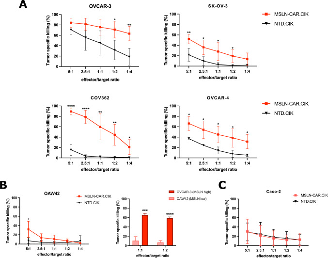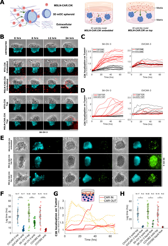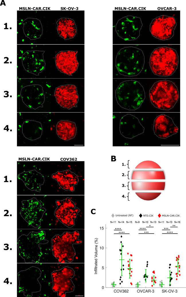 Three-dimensional dynamics of mesothelin-targeted CAR.CIK lymphocytes against ovarian cancer peritoneal carcinomatosis